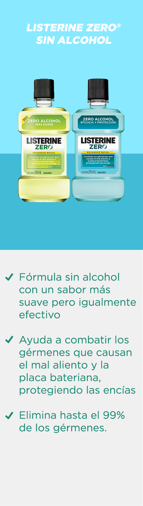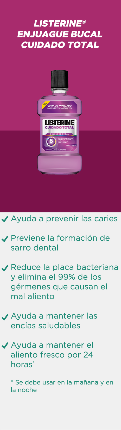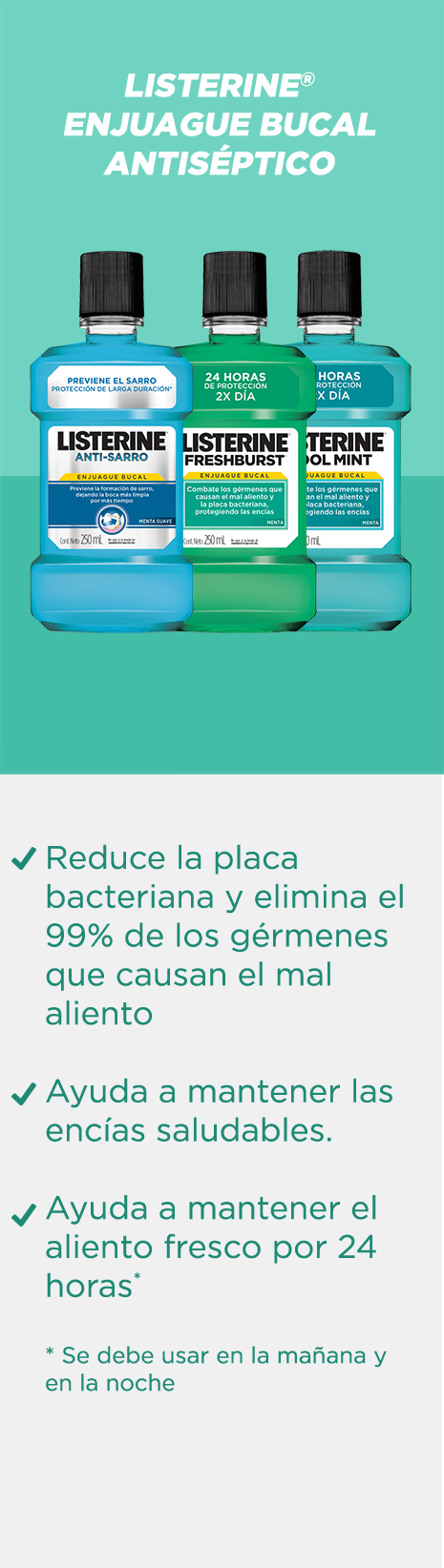 Todas las variedades de enjuagues bucales LISTERINE® eliminan los gérmenes que causan el mal aliento y refrescan tu boca, dejándola completamente limpia.